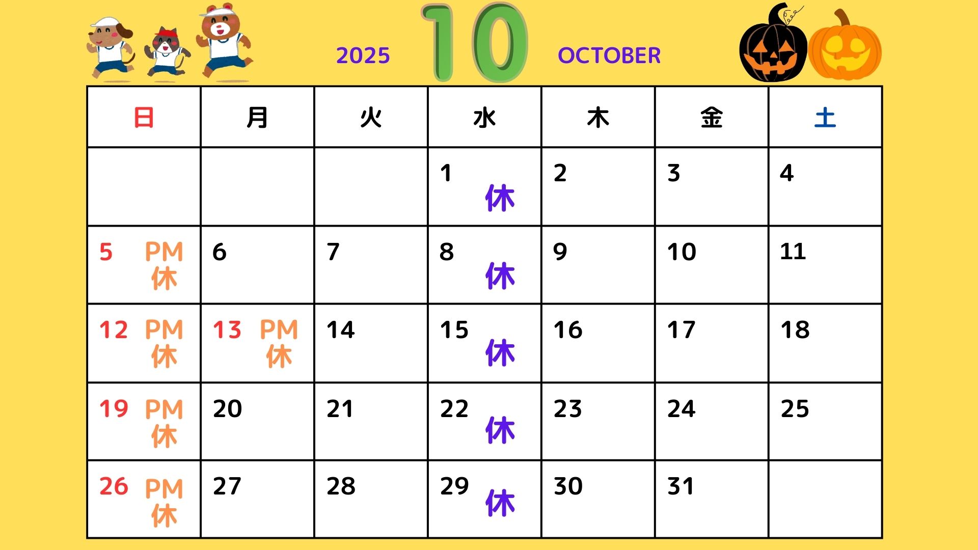 日曜・祝日(13日[スポーツの日]は午前診療のみ、水曜日は終日休診となります