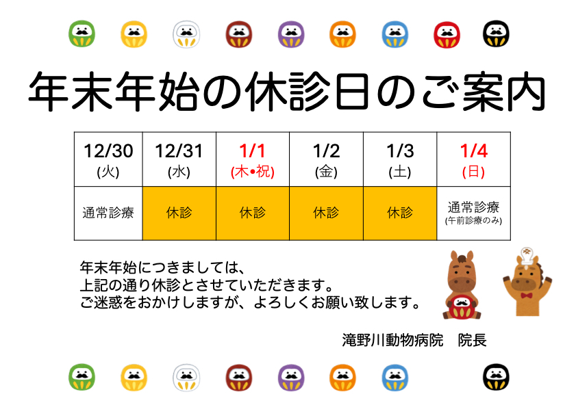 年末年始は12月31日から1月3日まで休診となります。予めご了承ください。