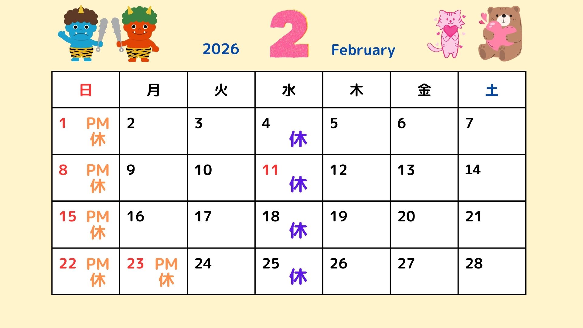 2月は通常通り、日曜・祝日(23日[天皇誕生日])は午前診療のみ、水曜日は終日休診となります。